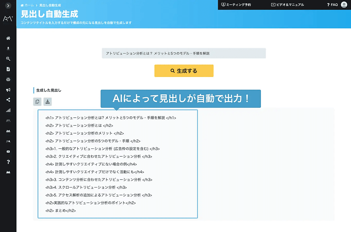搭載したのは、主にテストを目的にするα版で、コンテンツのタイトル案からコンテンツ構成(見出し構成)を提案する機能を提供する。想定タイトルを入力すると、見出し(h2、h3タグ)の構成を自動で提案。自社のウェブサイト情報や、業界内で満足度が高いと思われるコンテンツの情報を事前に入力しておくと、内容を学習・チューニングして提案する。