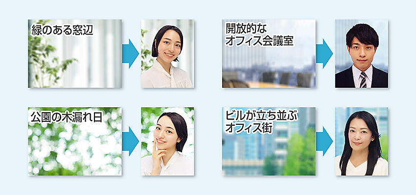 リモートワークが増加する中、ウェブ会議やビジネスチャットなどオンラインでのビジネス利用に使う顔写真のニーズが高まっていることに対応した。通常の証明写真のような青色などの単色とは異なる背景を加えた。緑のある窓辺▽公園の木漏れ日▽開放的なオフィス会議室▽ビルが立ち並ぶオフィス街--の4種類の背景画像を用意。選択して使用できる。