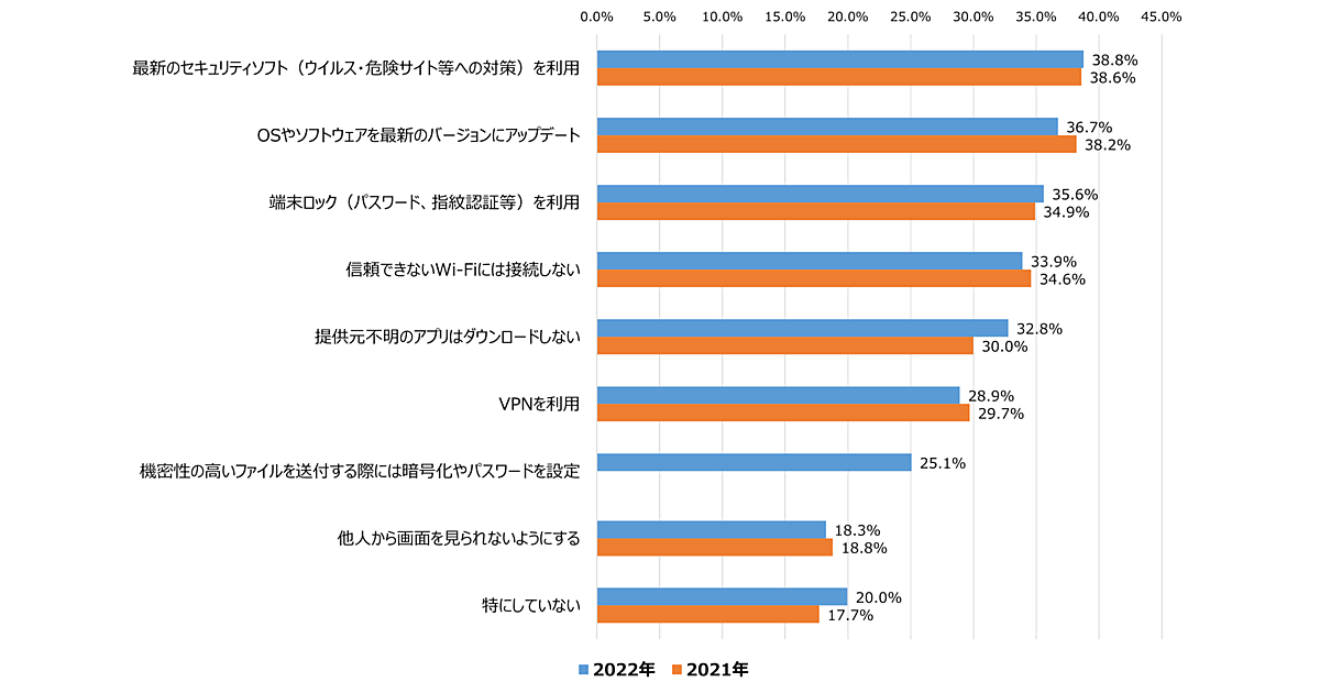 テレワークでのセキュリティ対策としては、「最新のセキュリティソフト(ウイルス・危険サイトなどへの対策)を利用」が38.8%と最も多く、以下「OSやソフトウェアを最新のバージョンにアップデート」、「端末ロック(パスワード、指紋認証など)を利用」と続いた。2021年との比較では、それぞれの項目で若干の増減があったものの、大きな変化は見られなかった。