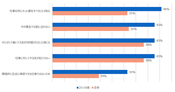 そこで「仕事に全力で取り組まない理由」を全世代とミレニアル世代で比較すると、全世代では「がんばって働いてもあまり評価されないと感じる」「仕事に対してやる気が起こらない」が優勢な一方、ミレニアル世代では「仕事以外にもっと優先すべきことがある」46%が最多で、「今の賃金では割に合わない」「がんばって働いてもあまり評価されないと感じる」「仕事に対してやる気が起こらない」の3項目がいずれも43%でそれに続いた。