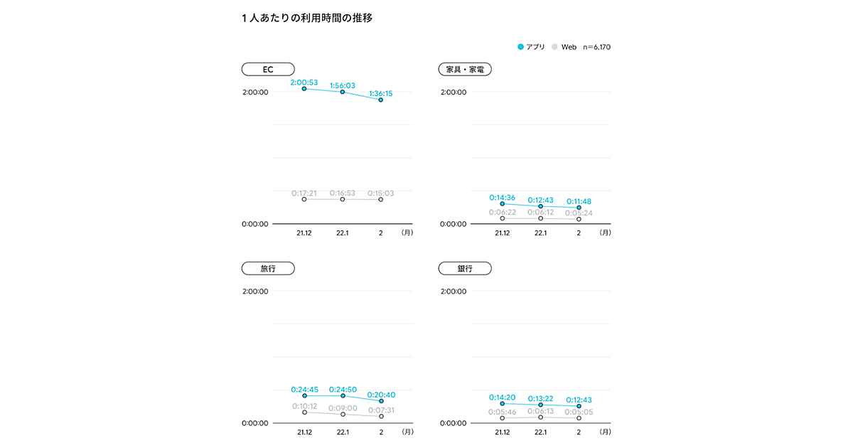 1人あたりの利用時間の推移を見ると、いずれのカテゴリでもアプリがWebを上回っており、特に「EC」では大きな差がついた。