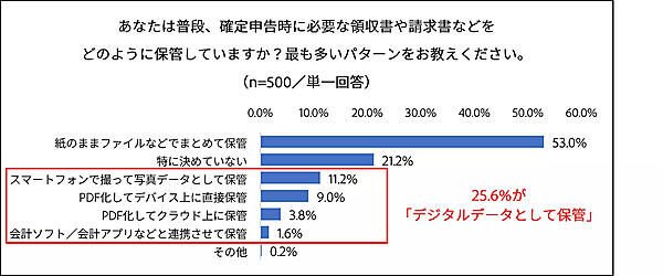 続いて「領収書や請求書などの帳票をふだんどのように保管しているか」を聞くと、「紙のままファイルなどでまとめて保管」53.0%が最多、「特に決めていない」21.2%がそれに続いた。そのほか「写真で撮影してデータ保存」「PDF化してローカル保存/クラウド保存」「会計ソフトと連携させて保管」など、なんらかのデジタル化を行っていたのは25.6%だった。