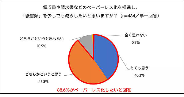 領収書や請求書などを「紙書類」で管理している484人に「紙書類を減らしたいか」を聞くと、「とても思う」40.3%、「どちらかというと思う」48.3%で、9割近くがペーパーレス化を要望していた。それなのにできていない理由としては、「対応する時間がない」34.8%、「ソフトや機器購入に費用がかかる」25.2%、「何をしてよいかわからない」22.2%と、時間や知識の不足が理由としてあがっている。「OCR(光学文字認識)」を知らない・使っていない人も多いという。