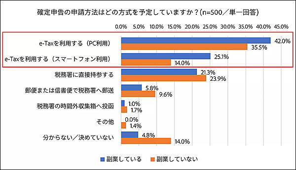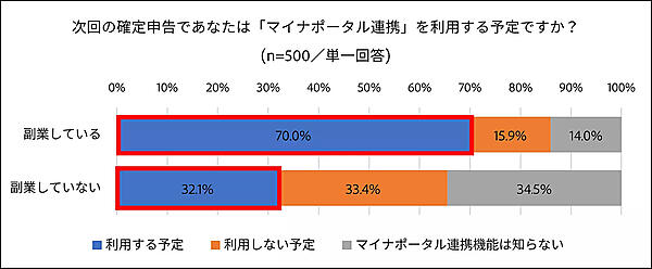 「確定申告の申請方法」について比較しても、「e-Taxを利用する(PC利用)+e-Taxを利用する(スマートフォン利用)」が、副業者は67.1%だったのに対し、副業をしていない層は49.5%とかなり下回っている。「マイナポータル連携」の利用予定では、副業者70.0%、副業をしていない層32.1%と、倍以上の差が付いた。やはり副業をしている人ほど、仕組みの理解やデジタル化が進んでいるようだ。