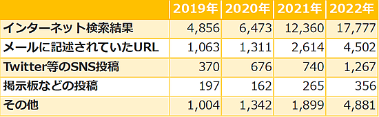 「どのようにそのサイトを知りましたか」との質問に対してが、今回も「インターネット検索結果」が最多で17,777件(61%)を占める。前年と比べても約1.4倍の増加となっており、不正広告など検索結果汚染が進んでいることがわかる。