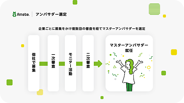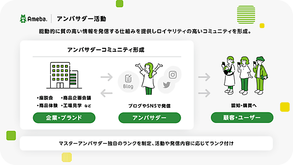 サイバーエージェントは、同社が展開するネットサービス「Ameba」でロイヤリティの高いファンを醸成してマーケティングに活用するアンバサダープログラム「Ameba協業マスターアンバサダープログラム」の提供を始める、と2月21日に発表した。18年間のブログ運営の実績と培ったメディアノウハウを生かし、Amebaブロガーから複数審査を経て企業に合った「マスターアンバサダー」を選定してファンマーケティングを支援する。