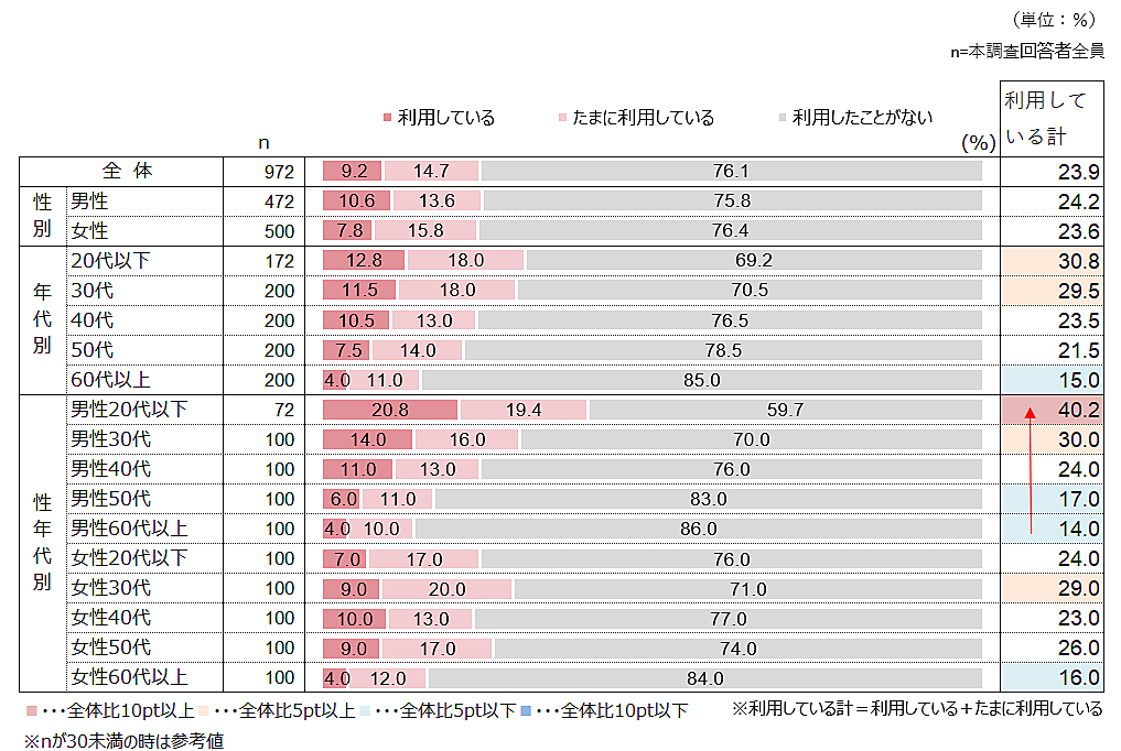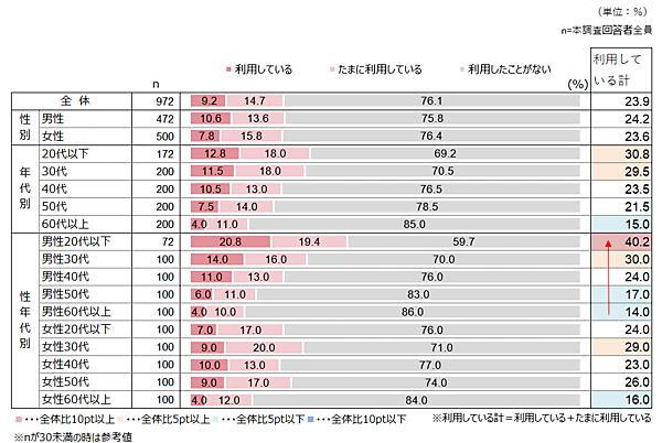 さらに「ネットスーパー」としての利用を聞くと、利用者は23.9%。性年代別では男性20代以下が40.2%に達する一方、男性60代以上は14.0%と全性年代別で最低値。女性60代以上も16.0%と低く、高齢者に浸透していないことがわかる。