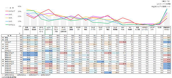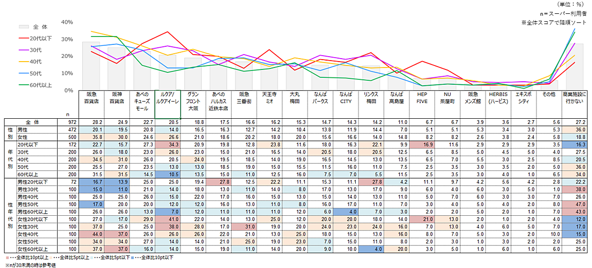 年代別で見ると20代は「ルクア/ルクアイーレ」「天王寺ミオ」「リンクス梅田」「HEP FIVE」などが他世代より人気を集めている。