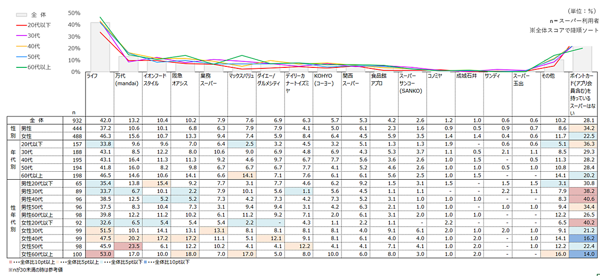 各スーパーの「ポイントカード(アプリ会員含む)の保有状況」を聞くと、各年代でもっともポイントカードの保有率の高いスーパーは「ライフ」だった。「阪急オアシス」「マックスバリュ」は60代以上のポイントカード保有率が高めだった。