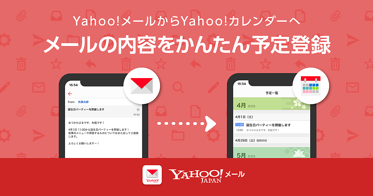 仕事や個人的な予定の連絡、店舗・施設・病院の予約完了通知のメールを受信した後、内容をカレンダーアプリに登録したり手帳に記入したりする手間が省ける。Yahoo!メールでは飲食・宿泊・美容などの一部予約サービス利用時に予約完了メールを受け取ると、Yahoo!カレンダーに登録される機能を2018年に導入。今回の機能で全メールで可能にした。