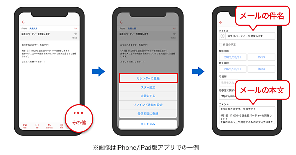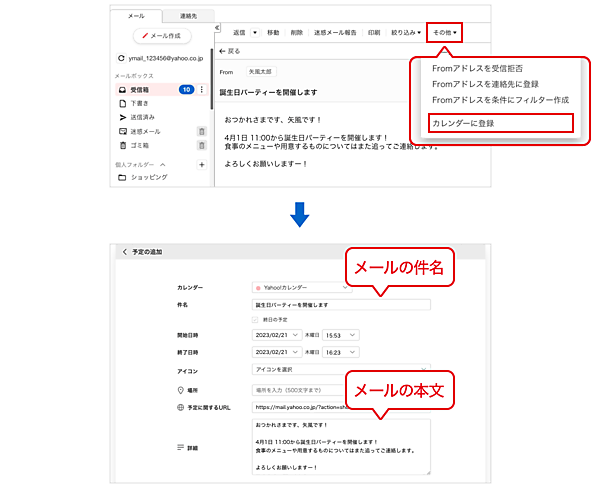 Yahoo!メールからの予定登録の流れは、アプリ版、パソコン版とも①メール本文画面で「その他」を選択②メニューから「カレンダーに登録」を選択③予定登録画面で必要に応じて日時・場所などを入力④「保存」を選択--となる。このうち、③の開始・終了日時では現在の日時が自動的に入力され、場所は入力されないため、自ら入れる必要がある。