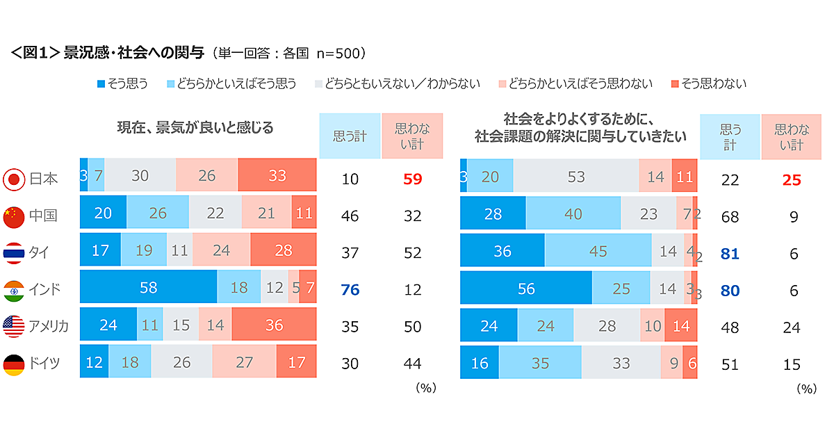 まず、「現在、景気が良いと感じる」人の割合は、インドが76%と最も高かった。「社会をよりよくするために、社会課題の解決に関与していきたい」については、タイが81%、インドが80%と高い。日本は、景況感・社会関与ともに6カ国の中で最低値となった。