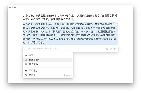 ①はページ全体や範囲選択した文章の情報を整理したり、会議の議事録やプロジェクト概要の要約を作成・翻訳したりできる。②は範囲選択した文章の改善・修正、文章量の調整、トーン変更などが可能。③はアイデアのブレインストーミングのサポートや、メリット・デメリットのリスト化、ブログやプレスリリース、会議のアジェンダのドラフト作成ができる。