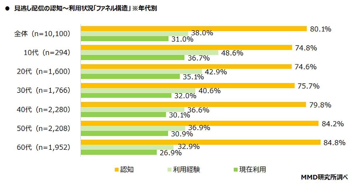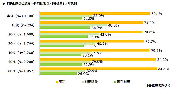 まず見逃し配信について「認知」「利用経験」「現在利用」の比率を見ると、まず全体では「認知」80.1%、「利用経験」38.0%、「現在利用」31.0%だった。年代別では高齢になるほど認知は増えるが利用は落ち込む。「認知」は60代84.8%が最多なのに、「利用経験」は10代48.6%、「現在利用」は10代36.7%が最多だ。