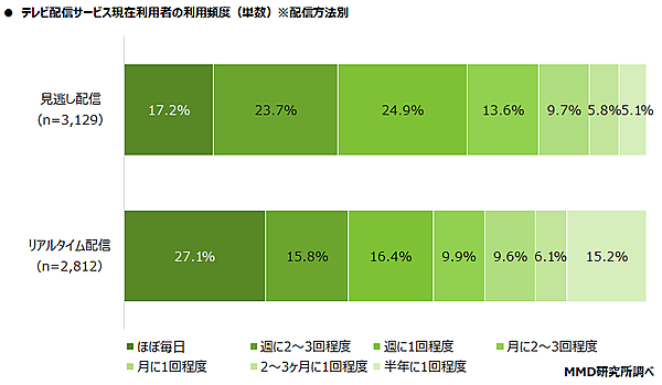 見逃し配信を利用している3,129人に、「見逃し配信の利用頻度」を聞くと、「ほぼ毎日」17.2%、「週に2~3回程度」23.7%、「週に1回程度」24.9%。同様にリアルタイム配信を利用している2,812人に利用頻度を聞くと、こちらは「ほぼ毎日」27.1%、「週に2~3回程度」15.8%、「週に1回程度」16.4%で、どちらも着実に浸透している。