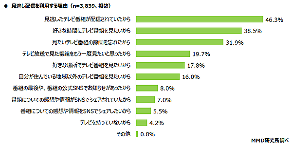 あわせてそれぞれのサービスの「利用理由」を聞くと、見逃し配信では「見逃したテレビ番組が配信されていたから」46.3%、「好きな時間にテレビ番組を見たいから」38.5%、「見たいテレビ番組の録画を忘れたから」31.9%が上位。