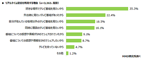 リアルタイム配信では、「好きな場所でテレビ番組を見たいから」35.3%、「外出時に見たいテレビ番組があったから」22.4%、「自分が住んでいる地域以外のテレビ番組を見たいから」16.5%が上位だった。見逃し配信はコンテンツ内容、リアルタイム配信は視聴場所によって利用が増えるようだ。