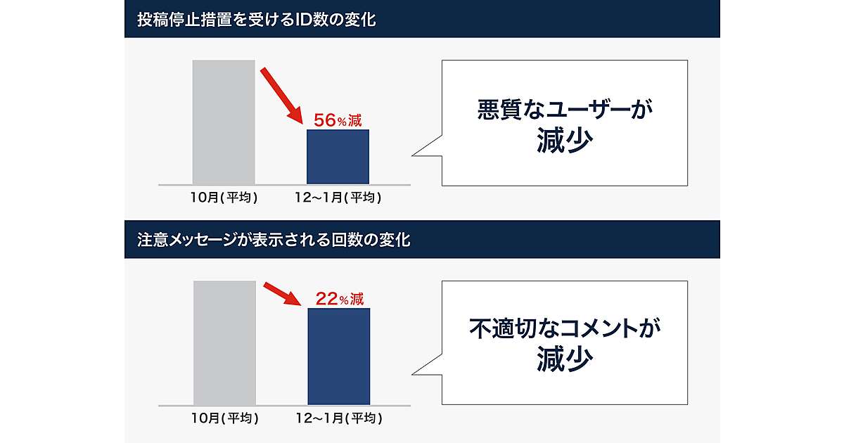 携帯電話番号の設定必須化を導入する前の2022年10月と、必須後の12月~2023年1月の平均を比べると、投稿停止措置を受けるID数が56%減少し、悪質なユーザーが減った。コメントポリシーに違反するコメントを複数回投稿しているIDに対して表示する「投稿時の注意メッセージ」も、同期間の比較で22%減り、不適切なコメントも減少した。