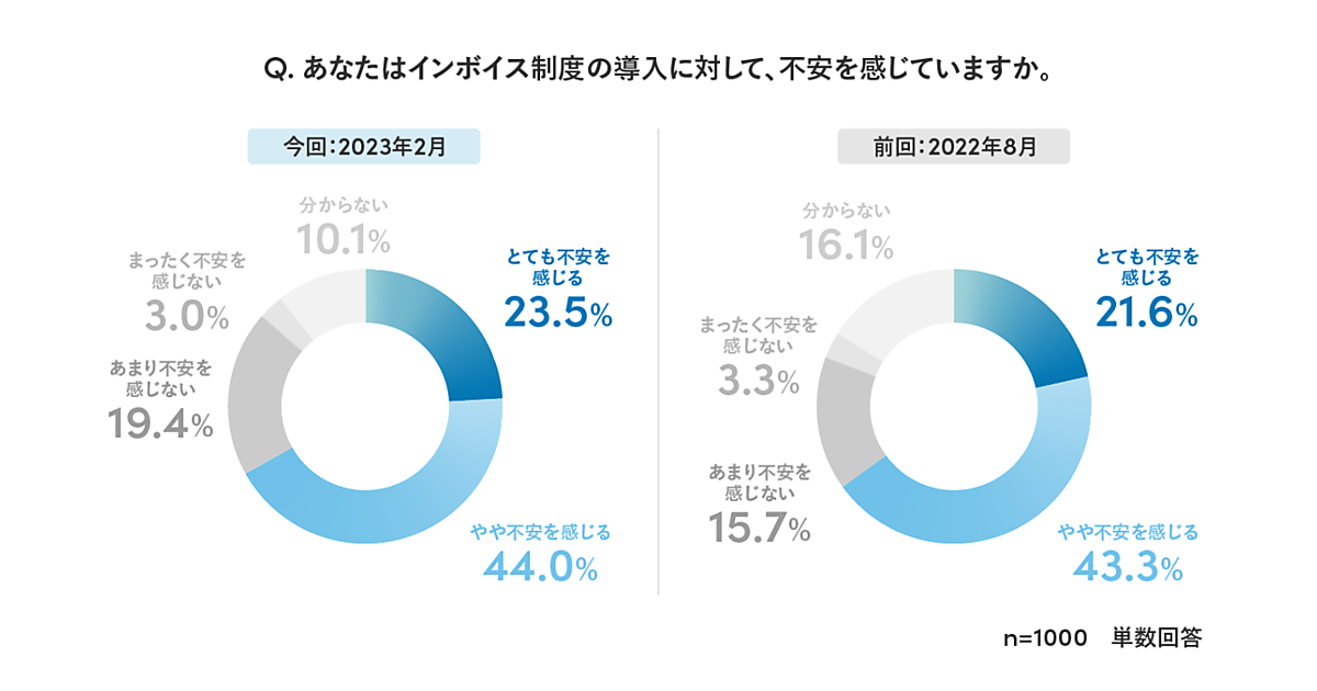 また、インボイス制度の導入に関しては、合計で67.5%が「不安を感じる」と回答しており、前回調査よりも2.6ポイントの増加となった。
