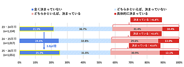 まず「大学卒業後に自分が就きたい仕事・キャリアの方向性が定まっているか」と聞くと、「決まっている(具体的に+どちらかといえば)」は43.0%で前年から0.4ポイント微増。一方「まったく決まっていない」も25.3%で前年から3.8ポイント増加していた。方向性が決まっている学生に「キャリアを意識し始めた時期」を聞くと、「高校生時」40.4%が最多で、「大学生時」26.1%、「中学生時」19.9%がそれに続く。進学時に将来を見据えて学校を選択している人が多い。
