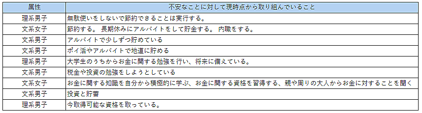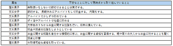 「自分の将来に対してもっとも不安に感じること」を聞くと、「お金」29.8%が最多で、前回調査1位だった「就職活動」を上回った。「お金の不安に対して、現時点で取り組んでいること」を自由回答で聞くと、「節約・貯蓄」「アルバイト」「投資」「資格の取得」といった意見があがった。なお「投資を実施している」と回答したのは全体の17.1%。現在投資を実施していない学生も、約6割が興味関心を示したという。