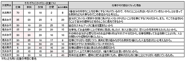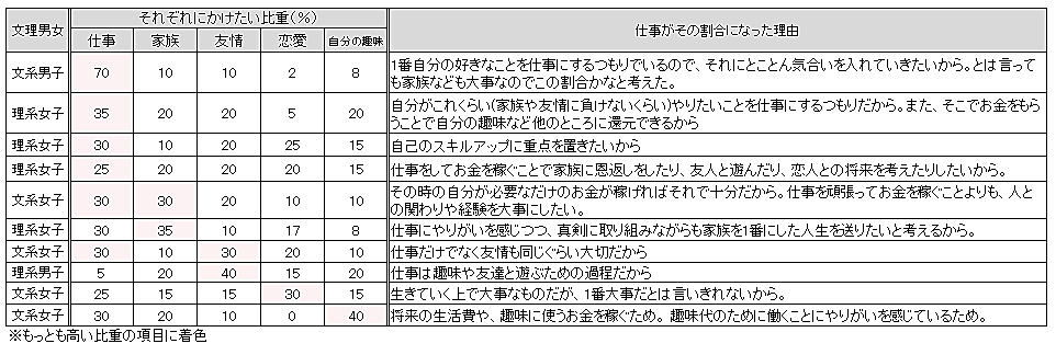 「仕事」の比率の理由を自由意見で見ると、「家族や友情に負けないくらいやりたいことを仕事にするつもり」「趣味代のために働くことにやりがいを感じる」などの意見があった。