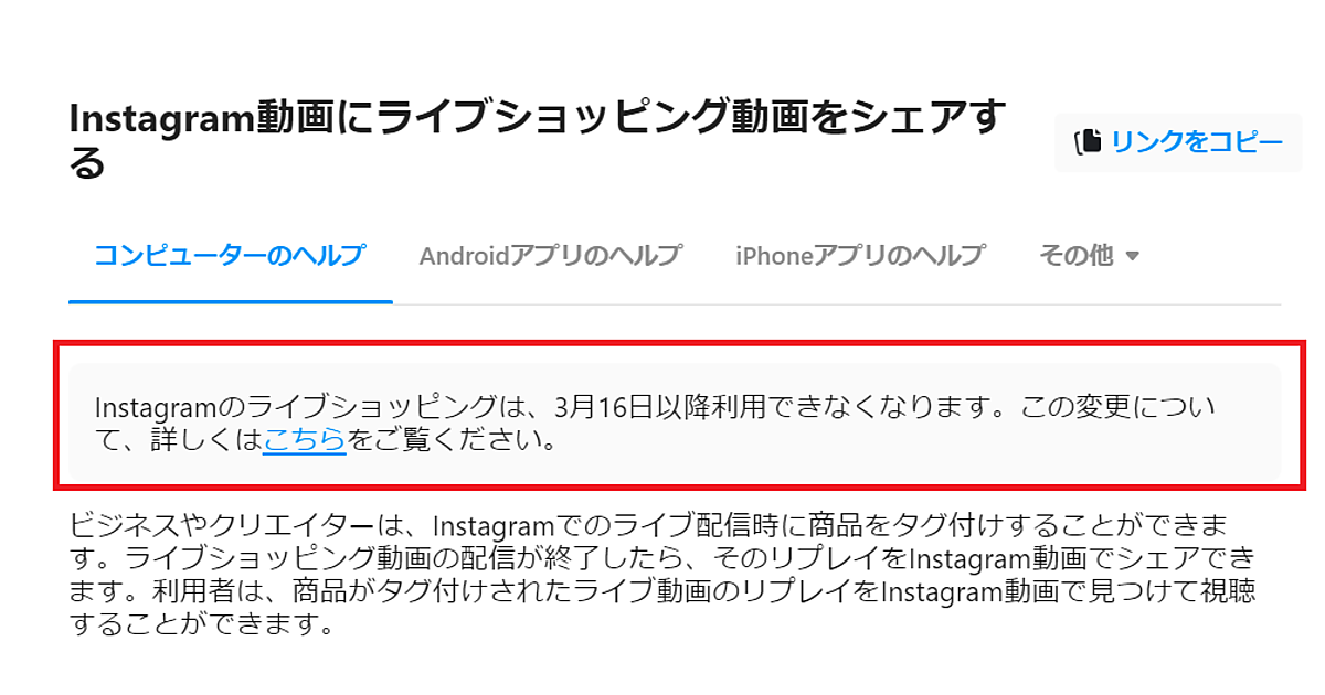 Meta日本法人Facebook Japanは、Instagramのヘルプセンターにライブショッピング機能が3月16日以降利用できなくなる旨を追記した。