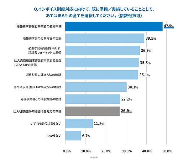 具体的に「インボイス制度への対応」の内容を聞くと、「適格請求書発行事業者の登録申請」47.5%だった。2位に「適格請求書の記載内容の理解」39.5%、「必要な記載内容を満たすフォーマットの準備」36.7%が続く。一方で、受領側が必要な「仕入税額控除の経過措置の準備」は26.9%に留まった。