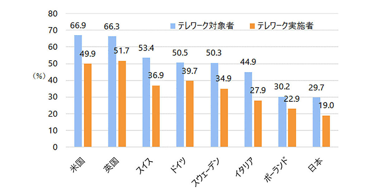 また、テレワークの実施状況について、テレワーク対象者(テレワークが可能な人)とテレワーク実施者(実際にテレワークをしている人)に分けて調べると、上図のようになった。米英ではテレワーク対象者が6割以上、スイス、ドイツ、スウェーデンでも5割以上と高かったが、日本は調査対象国では最も低く、テレワーク対象者は29.7%、実施者は19.0%となった。