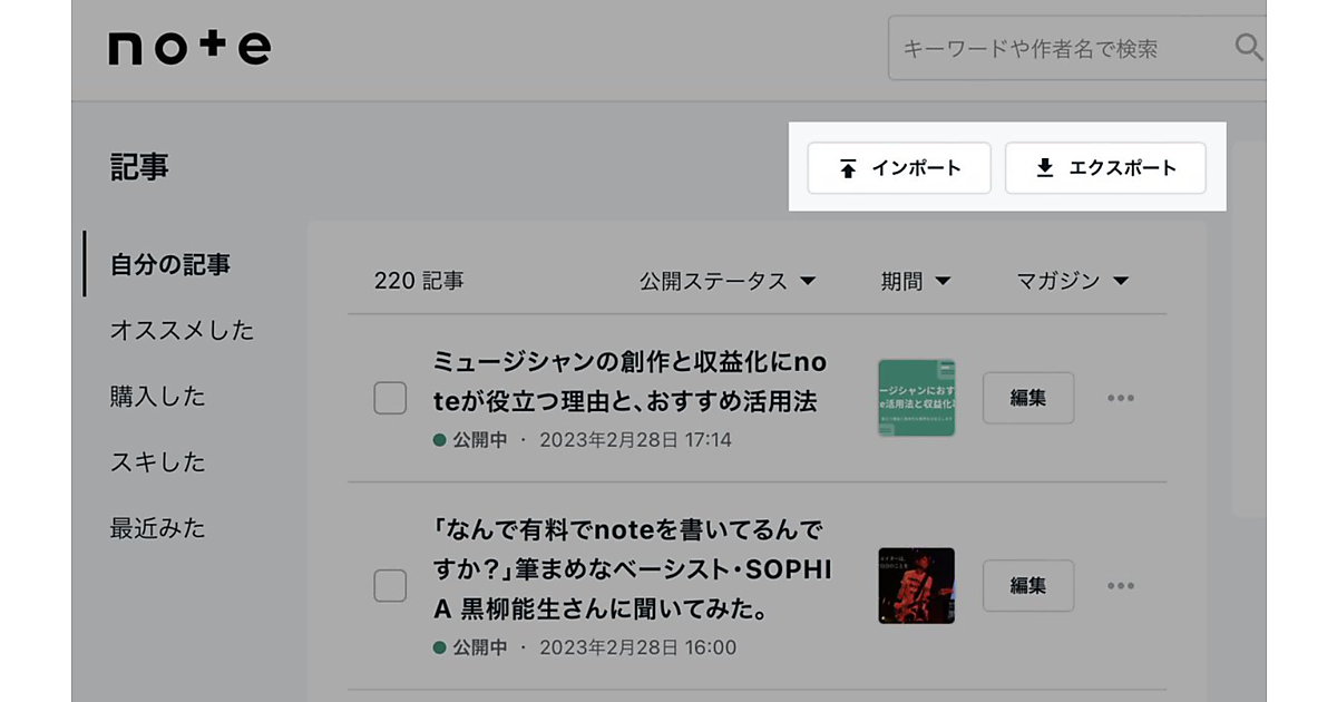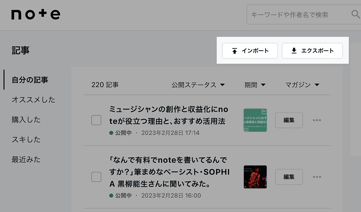 3日以内にメールでインポートの完了メールが届くので、下書き状態で記事が追加されている記事ごとに「編集」ボタンから公開設定する。noteは、「LINE BLOGの約8年半の歴史と日々の投稿は未来につないでいくべき財産。プラットフォームの垣根を超えて、創作を楽しむクリエイターの活動を支援する」としている。LINE BLOGからのデータ取得(エクスポート)ツールは3月30日に提供する。