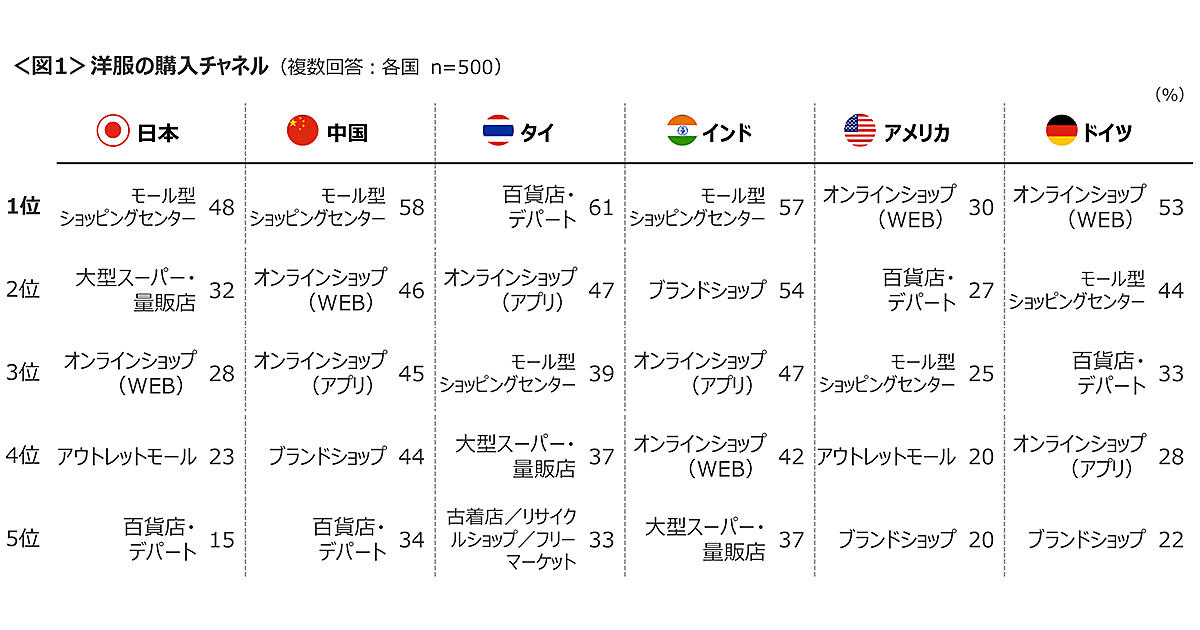 まず、洋服の購入先として一番多いのは、日本・中国・インドが「モール型ショッピングセンター」、タイが「百貨店・デパート」、アメリカ・ドイツは「オンラインショップ(WEB)」となった。特に、ドイツはWEBの利用が53%と高く、日本を除くアジアの3カ国では「オンラインショップ(アプリ)」の利用も多かった。