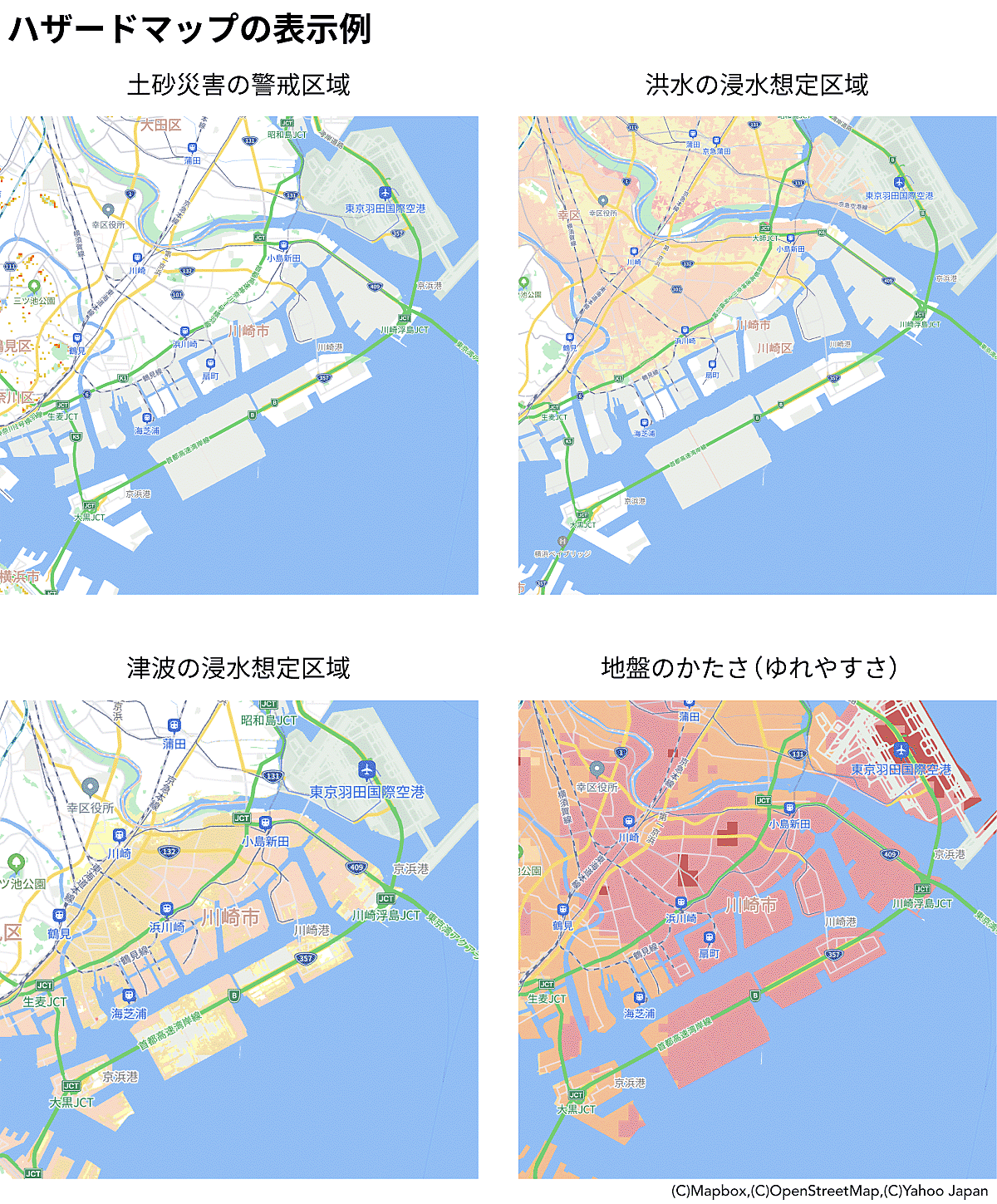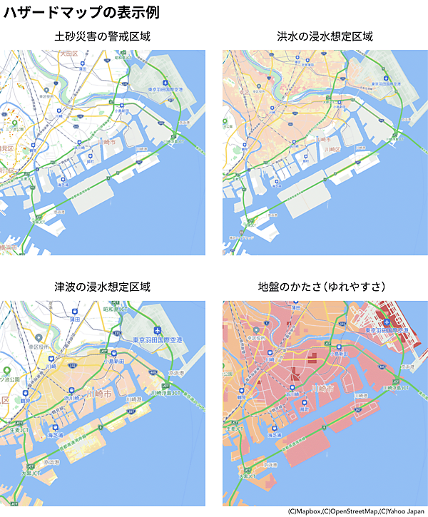 地図の範囲は自宅や職場を中心に南北約10km、東西約6km。防災モードのハザードマップでは、国土交通省や各自治体からのデータを元に「土砂災害の警戒区域」「洪水の浸水想定区域」「津波の浸水想定区域」「地盤のかたさ(ゆれやすさ)」の4つのハザード情報が通常の地図上に重なる形で表示される。災害や通信障害でインターネットが使用できないオフラインでも、ハザードマップや自宅や職場周辺の地図を確認できる。