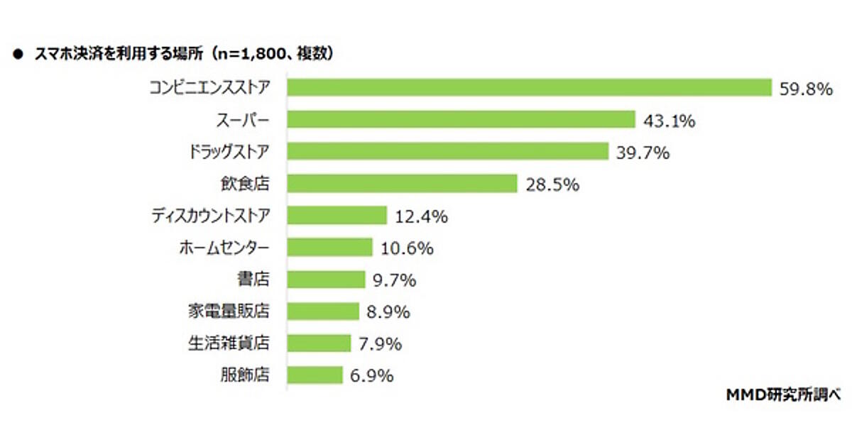 次に「メイン利用しているスマホ決済サービスを利用している場所」を聞くと、「コンビニエンスストア」59.8%が特に多く、以下「スーパー」43.1%、「ドラッグストア」39.7%が上位だった。