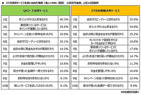 「メイン利用しているスマホ決済サービスを使い始めた理由」を聞くと、QRコード決済サービスでは「ポイントがたくさん貯まるから」40.3%、スマホ非接触決済サービスでは「会計がスピーディーに終わるから」35.4%で、動機に差が見られた。