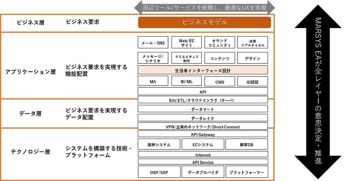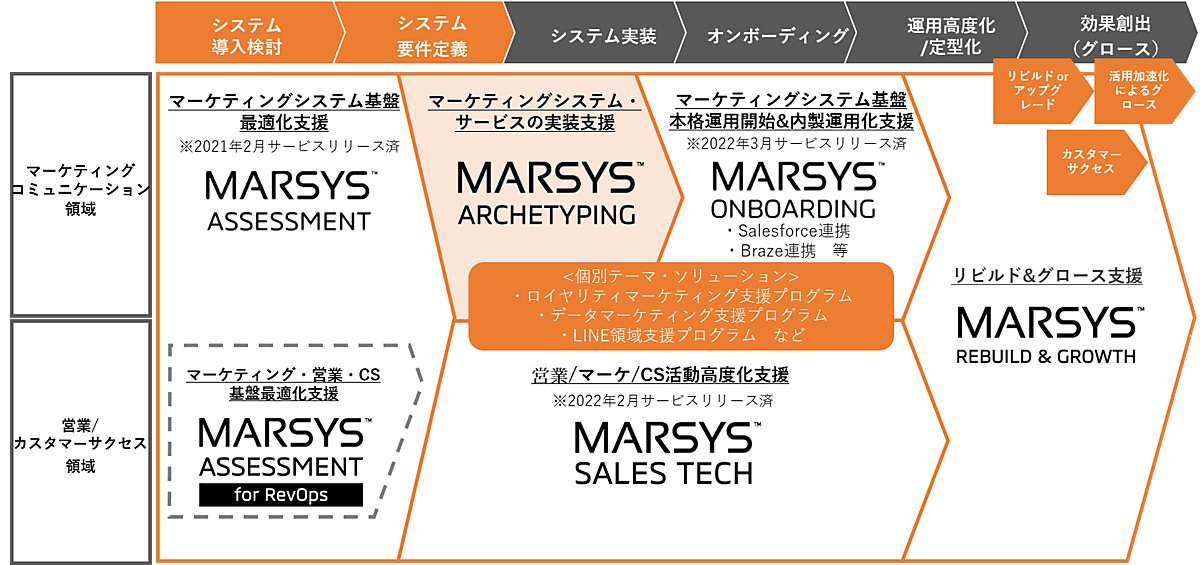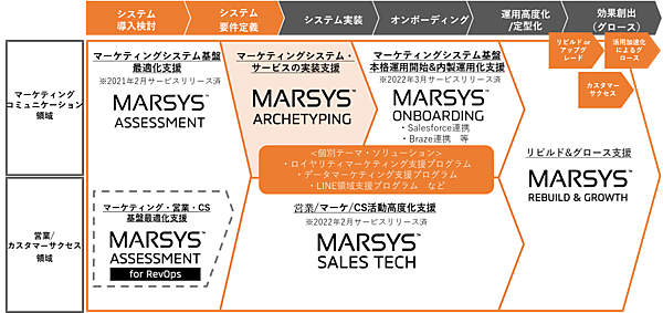 マーケティングとシステムの専門家の「MARSYS Enterprise Architect(マーシス・エンタープライズアーキテクト:MARSYS EA)」がオウンドサービス・CDP(顧客データ基盤)・MA(マーケティング自動化)を横断し、要件を常にアップデートして開発。さらに複数のパートナー会社と連携する柔軟な開発体制を構築する。開発に求められるクリエイティブ力や先端システムの評価知見を網羅することで、プロジェクトを円滑に推進する。