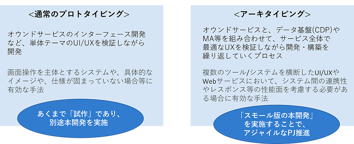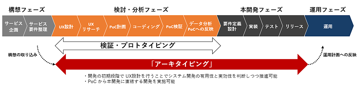 企業のDXを推進する戦略組織「HAKUHODO DX_UNITED」の取り組み。ビジネスやサービスの全体を俯瞰(ふかん)した開発プロセスを「アーキタイピング」と名付けた。精度の高い要件定義やPoCの実施、各フェーズでの課題把握によって、サービス開発・基盤構築を高速で効率的に進める。UXの最適化と、適切なマーケティング戦略の実践を両軸で推進するため、既存の周辺ツールやサービスも含めた全体で適切な施策を実行する。