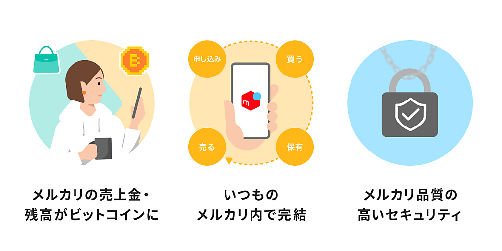 金融機関からチャージした残高や、メルカリでモノを売って得た売上金やポイントを活用してビットコインを購入できる。最小注文額は1円で、少額取引が可能。手数料は無料。メルカリのマイページから保有ビットコインの評価額や価格変動の確認ができる。ビットコインを売って得たお金は、いつでもスマートフォン決済サービス「メルペイ」の残高に移せるのでメルカリ内外での買い物に使用できる。