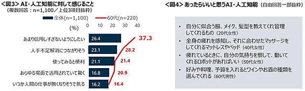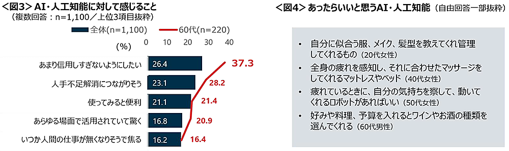 また一般論として「AIに対して感じること」を聞くと、「信頼しすぎないようにしたい」26.4%が最多で、慎重姿勢がみられる。特に年代別だと60代で37.3%にのぼるという。ただし「人手不足解消につながりそう」「使ってみると便利」という意見も多かった。