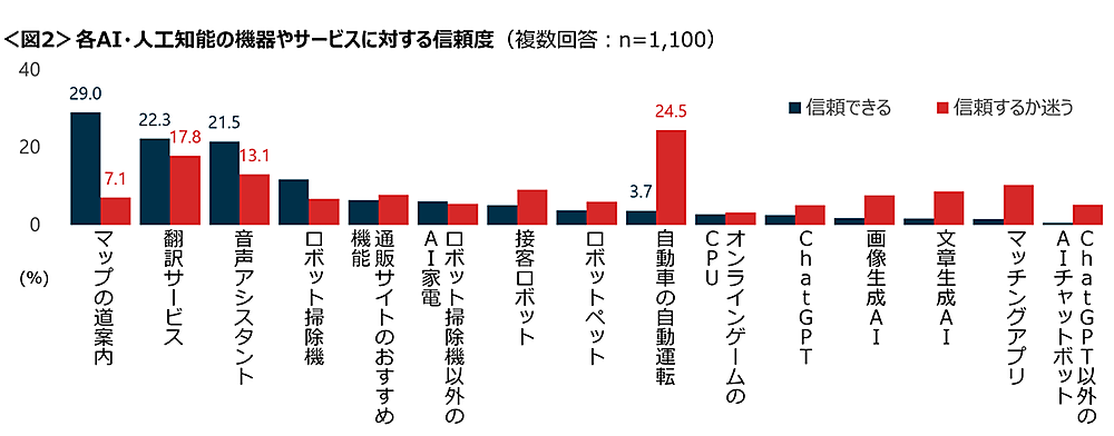 あわせて「AI・人工知能を使った機器やサービスを信頼しているか」を聞くと、各サービスで信頼度に差があることがわかった。