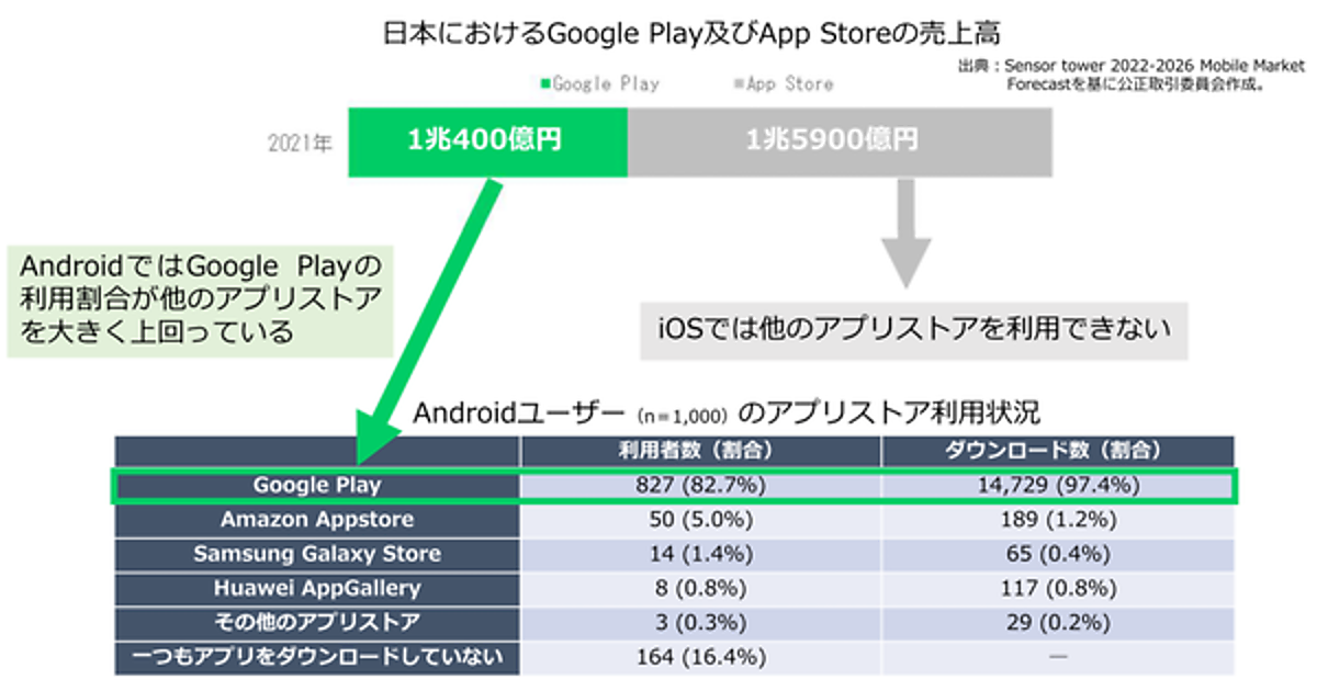 公正取引委員会は、「モバイルOS等に関する実態調査報告書」を発表した。モバイルOS市場とアプリ流通サービス市場のそれぞれについて、事業者の地位やシェアなどの市場構造、競争圧力の有無などについて、事業者アンケート(回答者数:596社)および消費者アンケート(2,000人)を行った。主要事業者キーマン23人からのヒアリングなども行っている。