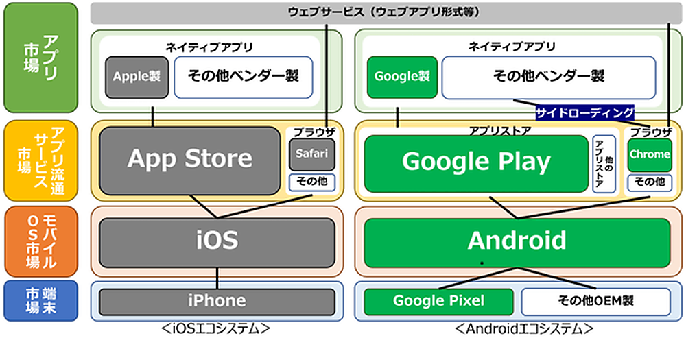 スマートフォン上では、「スマートフォン端末」「モバイルOS」「アプリストア」「ネイティブアプリ」がそれぞれの市場・エコシステムを形成している。大きくはGoogleおよびAppleにより二分されており、それぞれの市場で競争を繰り広げている。