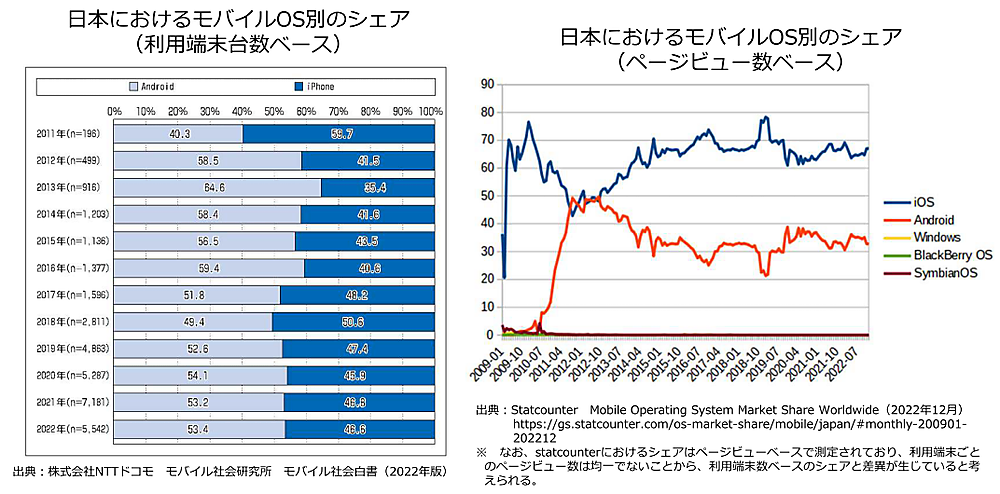 日本におけるモバイルOS別のシェア(利用端末台数ベース)を見ると、GoogleおよびApple(iPhone)はほぼ拮抗しているが、2012年以降は2018年を除きAndroidがわずかにシェアを上回っている(出典:NTTドコモ モバイル社会研究所「モバイル社会白書2022年版」)。