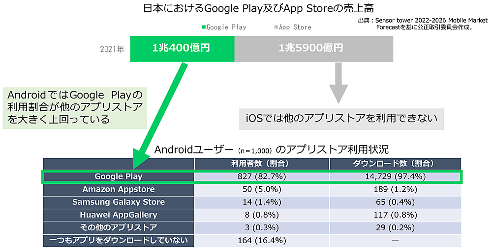 日本における「Google Play」「App Store」の売上高についても、2021年時点で「Google Play」1兆400億円、「App Store」1兆5,900億円とAppleが優勢だ。