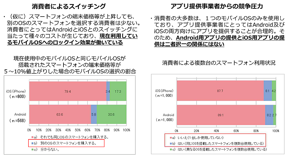 一方で消費者によるスイッチングという観点から見た場合のAndroid/iOS間の競争圧力、アプリ提供事業者からみたAndroid/iOS間の競争圧力については、「いずれも限定的」と公正取引委員会は考察している。