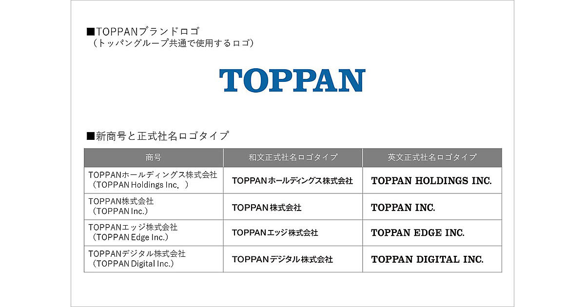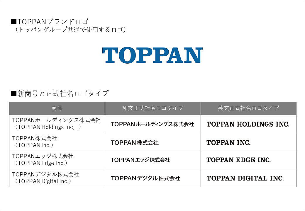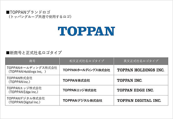 凸版印刷は、10月の持株会社体制への移行で商号を「TOPPANホールディングス」とし、事業を継承する事業会社を「TOPPAN」と「TOPPANデジタル」に決定した、と3月9日に発表した。新商号は凸版(トッパン)の名称を継承しつつ、グローバル企業として統一ブランドを世界で使用するため英字で「TOPPAN」と表記した。事業ポートフォリオ(構成)変革をさらに進めるため、既存の事業領域を規定した「印刷」を含めない商号にした。