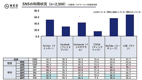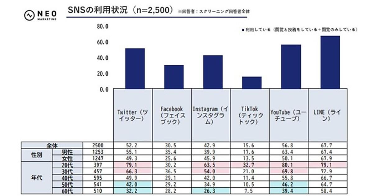 まず「主要SNSの利用状況」を聞くと、LINE利用率(アカウントを所持し閲覧と投稿をしている+アカウントを所持し閲覧はしているが投稿はしていない)は67.7%、YouTubeは56.8%、Twitterは52.2%だった。20代に限るとTwitterは79.1%にまで上昇する。