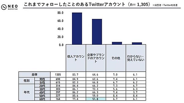 Twitter利用者1,305人に「これまでにフォローしたことのあるアカウントの種類」を聞くと、「個人アカウント」83.7%が最多だが、「企業やブランドのアカウント」も64.6%を占める。年代別で見ると、特に30代が企業ブランドアカウントをフォローしている。