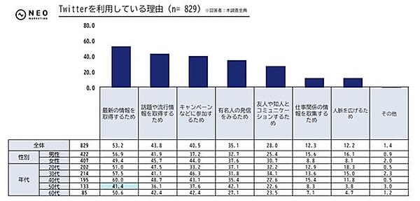 さらに「Twitterを利用している理由」を聞くと、「最新の情報を取得するため」53.2%、「話題や流行情報を取得するため」43.8%が上位だった。「仕事関係の情報を収集するため」の割合は12.3%と少ない。