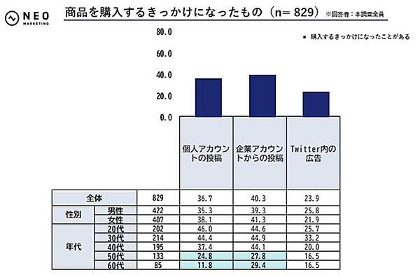 「商品を購入するきっかけ」について聞くと、「企業アカウントからの投稿」40.3%、「個人アカウントの投稿」36.7%で、わずかながら企業が上回った。