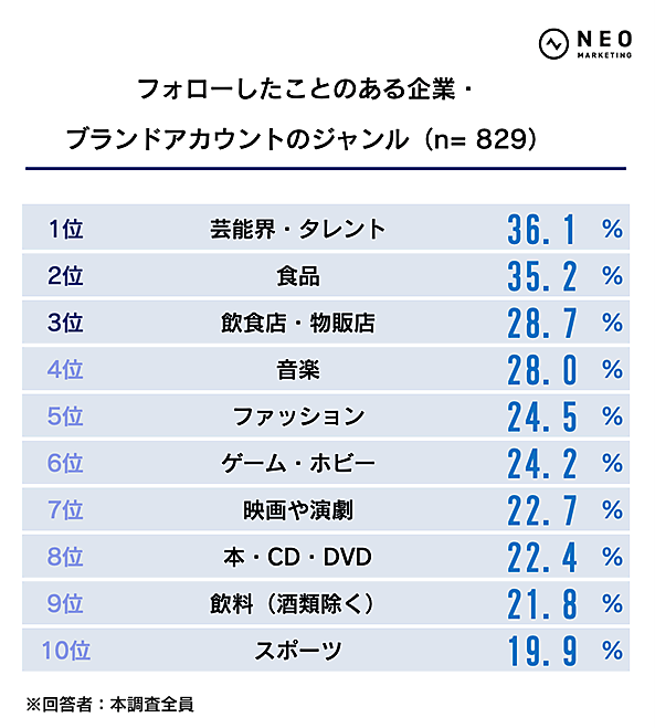 また「フォローしたことのある企業・ブランドアカウントのジャンル」では「芸能界・タレント」36.1%がやはり多いが、「食品」35.2%がそれに続く。以下は僅差で「飲食店・物販店」28.7%、「音楽」28.0%、「ファッション」24.5%が続いた。有名人を除くと生活に根ざしたものが多くを占める。